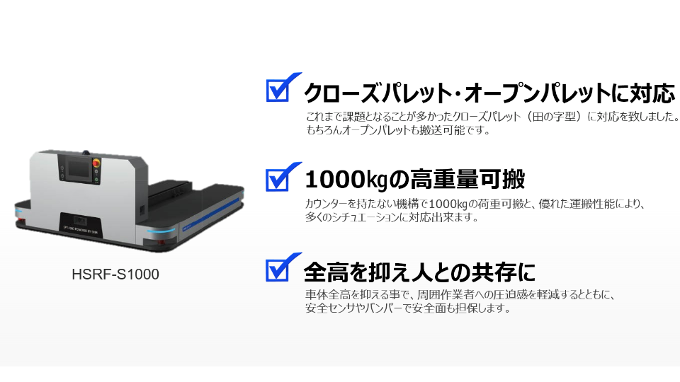 ・クローズパレット・オープンパレットに対応!これまで課題となることが多かったクローズパレット(田の字型)に対応を致しました。もちろんオープンパレットも搬送可能です。