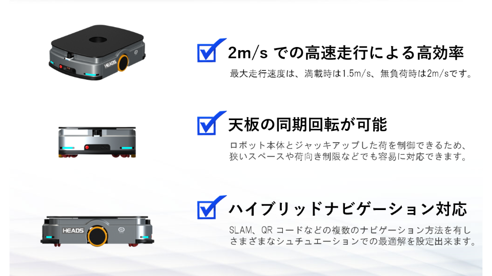 ・スピンターンによる効率的な搬送:天板回転によるスピンターンが可能で、SLAM/QRのハイブリット走行対応です。