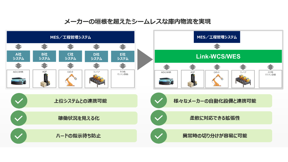 上位システム( MES/WMS )と自動化設備のインターフェースの役割を果たし、上位システムの情報をもとに、複数のロボットや設備を総合的に遠隔制御して、効率の良い運用を可能にした、「統合WCS」です。