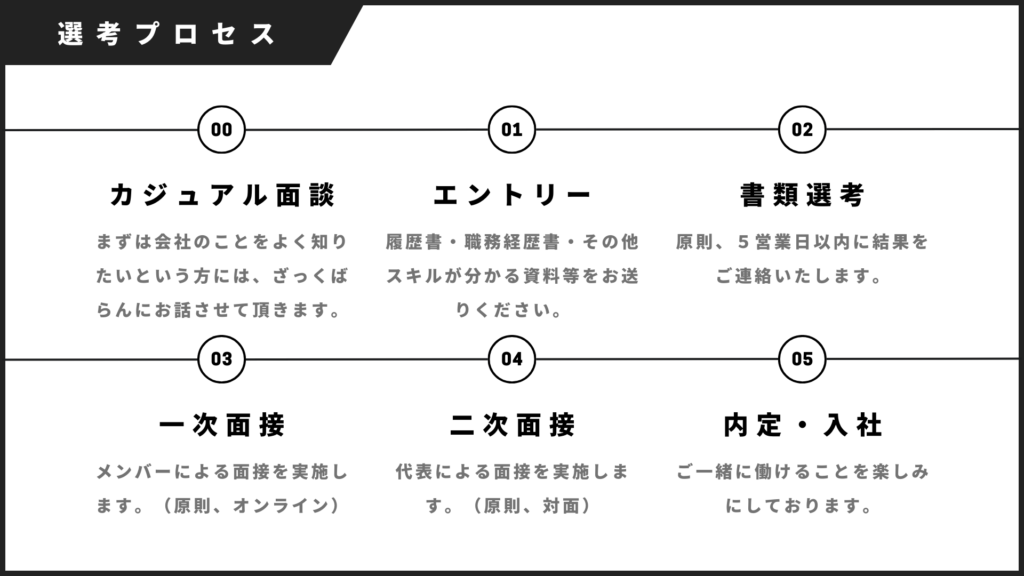 二つ、チームワーク。オープンなコミュニケーションを取り、チーム・会社全体を盛り上げて共に成長し、成功に導く人材が必要です。